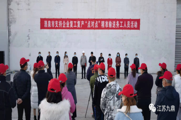 11月10日,酒泉市支持企業復工復產“點對點”精準輸送工人活動在甘肅九鼎隆重舉行。酒泉市副市長哈利別克、市人社局、酒泉經開區、人力資源公司及甘肅九鼎等相關單位領導出席了活動儀式。