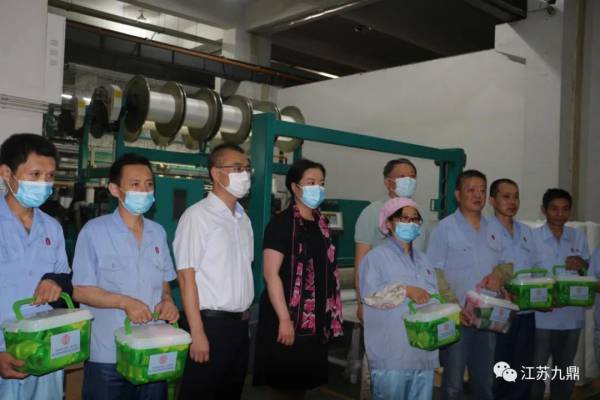 7月21日下午,如皋市常委、組織部部長朱瀅瀅在市總工會許益飛主席、程來斌主任,集團董事長顧清波、工會主席姜永健的陪同下,深入九鼎車間,慰問辛勤工作的一線員工,為他們送去了夏季防暑物品。