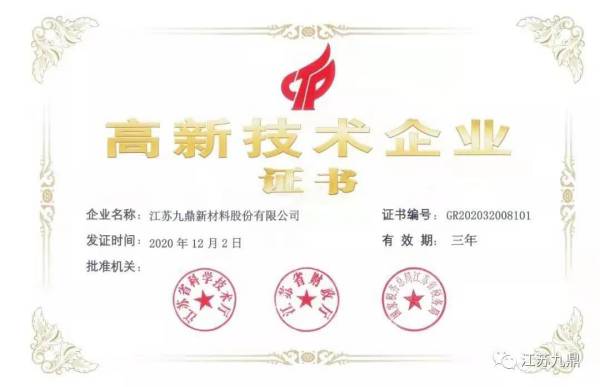 九鼎新材通過江蘇省高新技術企業復審